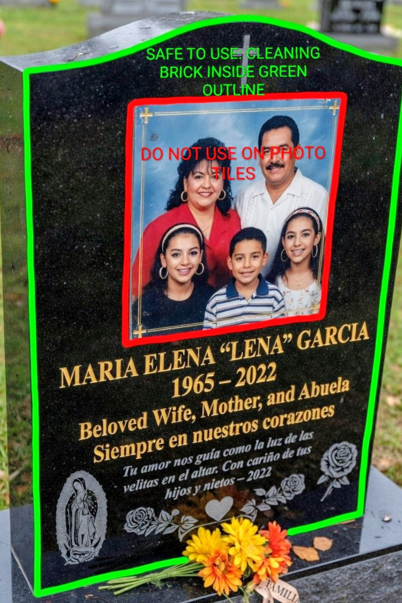 DO NOT USE ON Bronze headstones, Laser etched areas, Photo tile portraits